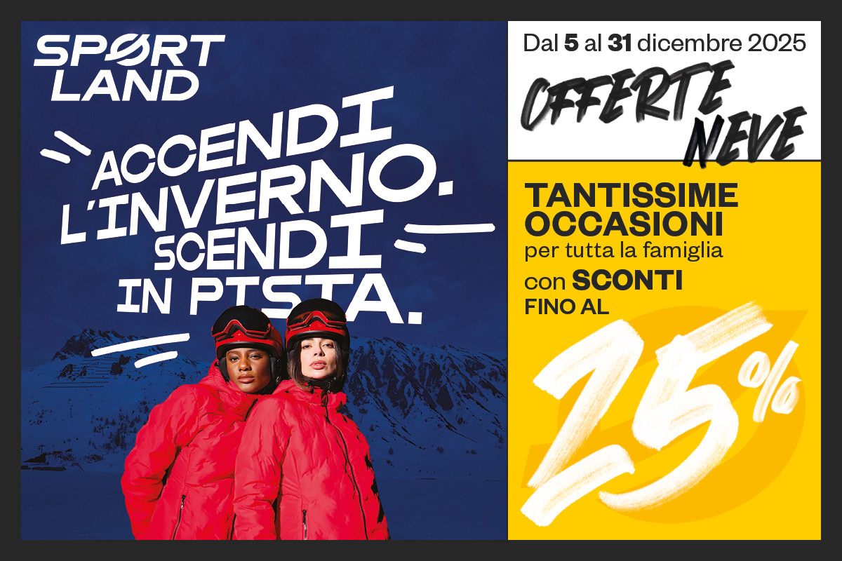 Dal 5 al 31 dicembre 2025 da Sportland arrivano le Offerte Neve: tantissime occasioni per tutta la famiglia con sconti fino al 25%